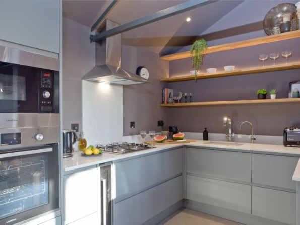 Modern gloss units with a built-in single electric oven and microwave and gas hob, full size fridge freezer, dishwasher, wine cooler, ice and ice bucket, kettle, toaster and Nespresso coffee machine