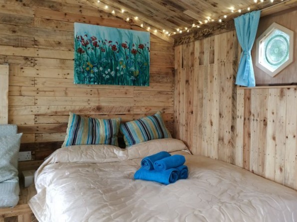 The cabin can sleep 2 adults and 2 children (or small adults), and it is one double, one single and one bunk bed. There's a separate bathroom (attached to the cabin but you need to go outside to access it) with a shower and washbasin. The compost toilet is about 10 meters from the cabin.