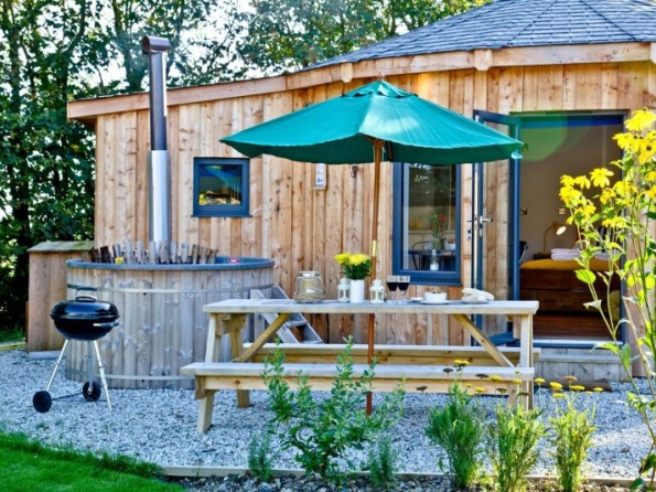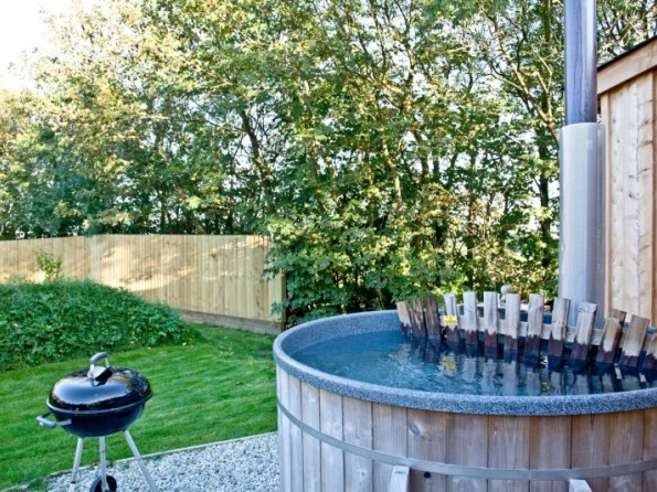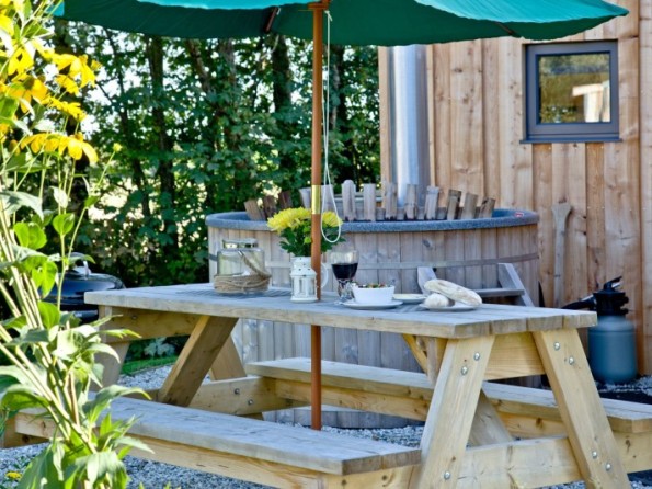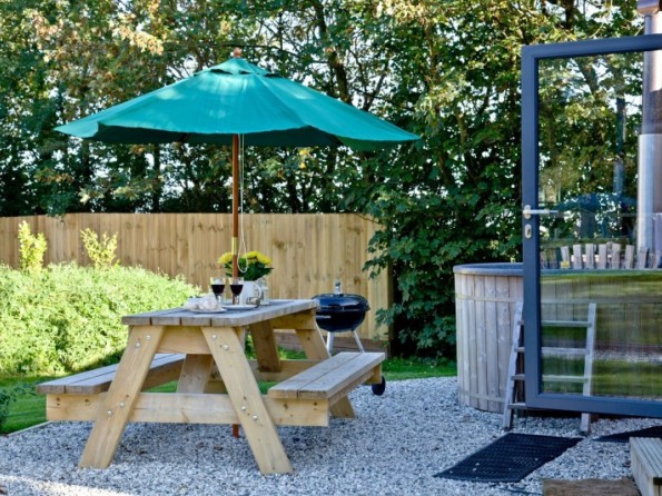 An outside area to the front of the property with electric hot tub and privacy screen, charcoal BBQ (utensils provided in kitchen) and a picnic bench