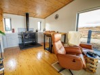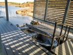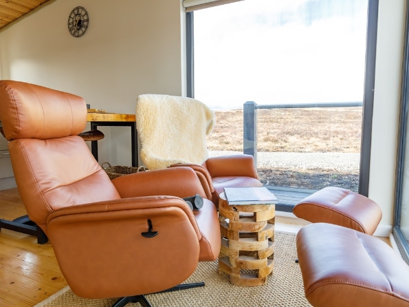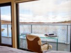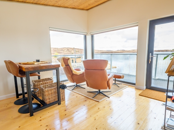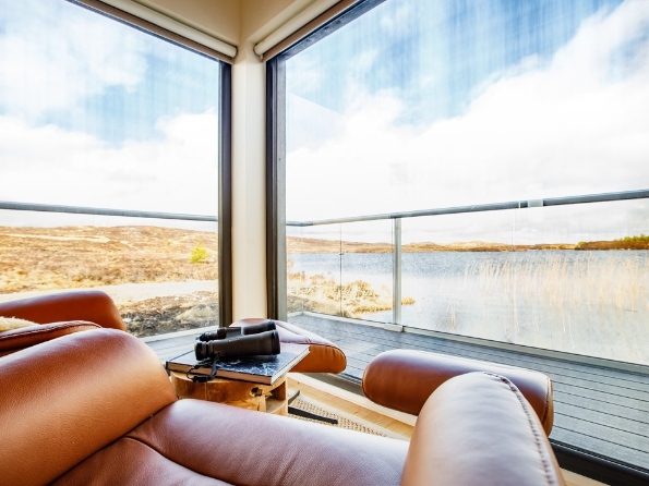The terrace runs around the lochside and there is an outdoor seating and table area with BBQ. The Scandinavian style hot tub sits on the banks of the loch, and there is a private pontoon with a rowing boat allowing you private access to the loch for fishing, or exploring the loch from the water.