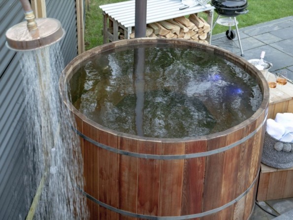 The hot tub is constructed entirely from Canadian Cedar wood and features both electric and (optional) wood burning stove heating.