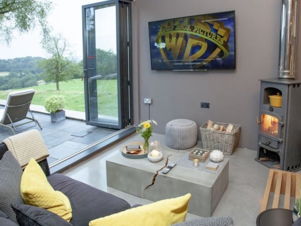 Split level seating area with a two seater sofa, wood burner, coffee table, wall mounted Smart TV with Netflix on a swivel bracket to allow viewing indoors and outside, three chairs and coffee table, Bluetooth speaker