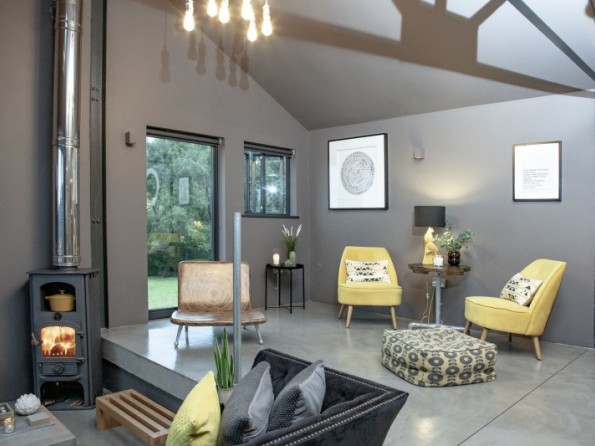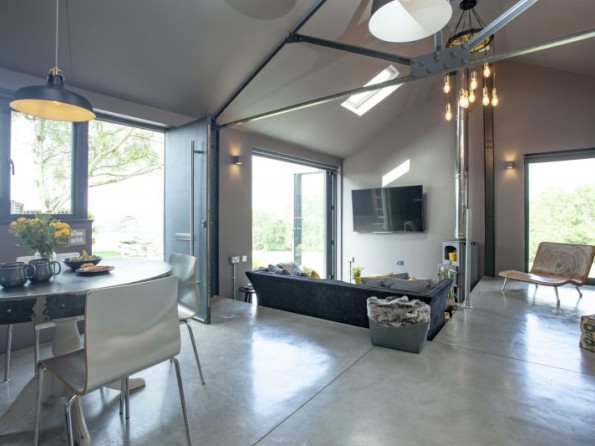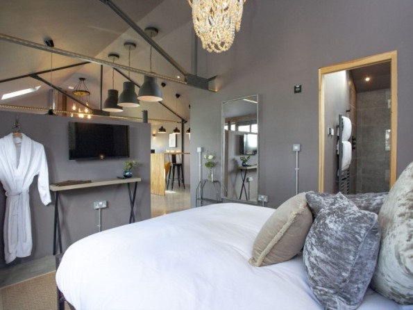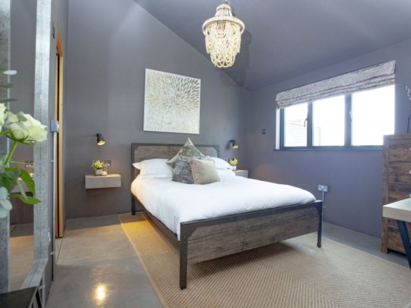 The perfect hideout for two, the Bolt can be found off the beaten track in a wild and rustic countryside setting; for the most part undiscovered and yet within only four minute’s-drive from the town of Wells. Designed around its original features there’s a distinctly urban feel to the space, with split-level polished concrete flooring and steel beams contrasting the interior’s plush retro styling. A contemporary wood burning stove, underfloor heating and chic furnishings add to the luxury of the open plan living area, while a modern kitchen complete with a cooker, fridge, and dishwasher means guests get to enjoy their time alone in complete comfort. A large folding door makes the most of the beautiful setting and rural views, flooding the home with natural light and inviting the fresh country air inside, and the deliberately darker colour palette that adorns the walls creates a romantic, sultry mood throughout. Carefully positioned lighting brings a unique atmosphere to every area within the space, and a gorgeous master bedroom featuring a king size bed and bespoke cowry shell chandelier; fashions a sumptuous retreat that’s perfectly suited to lazy mornings and breakfasts in bed.