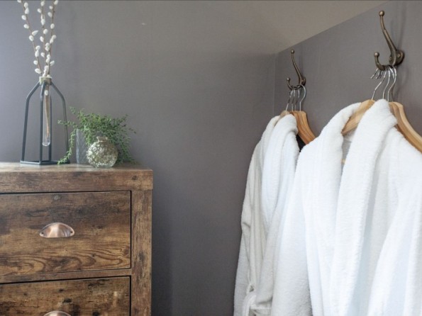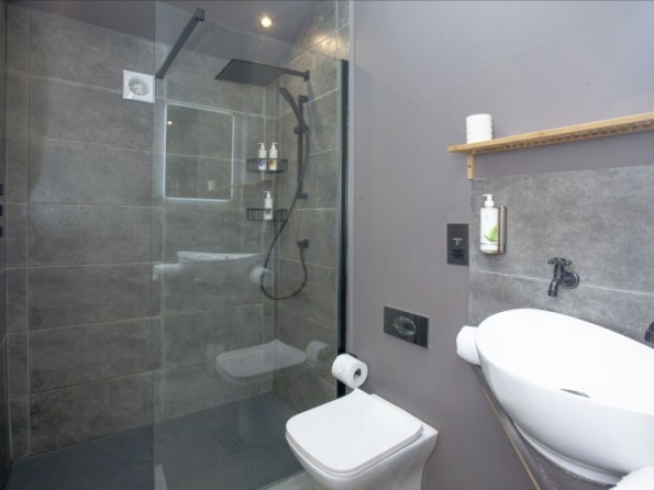 Walk in shower, wash basin, WC, heated towel rail and bathrobes.