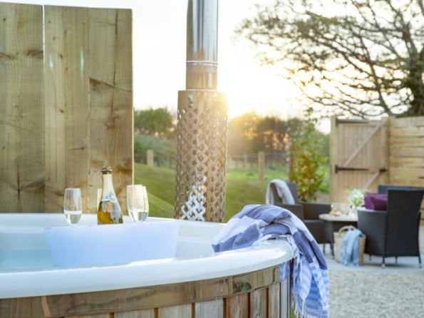You’ll be able to rustle up and share delicious meals in the fully equipped modern kitchen with its cleverly designed dining space or unwind on the large sofa in the lounge that has doors opening out to the private patio. The sumptuous king size bed beckons afternoon naps and long, decadently comfy nights while outside there’s a private wood-fired hot tub for soaking in as well as a furnished paved patio for alfresco dining garden in the sunshine.