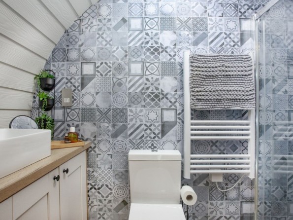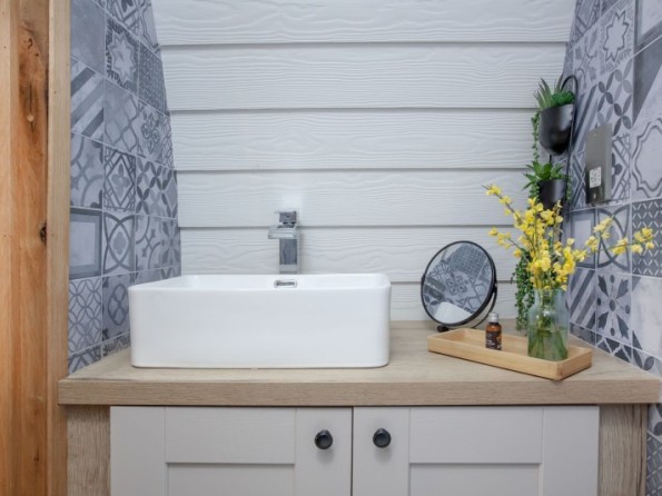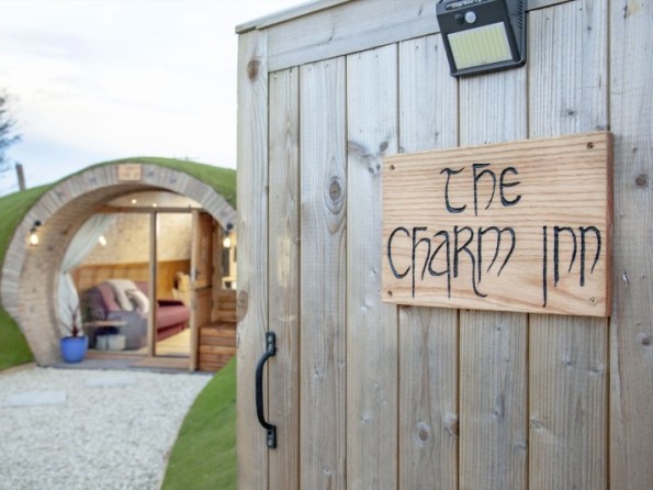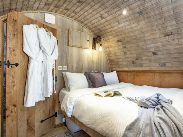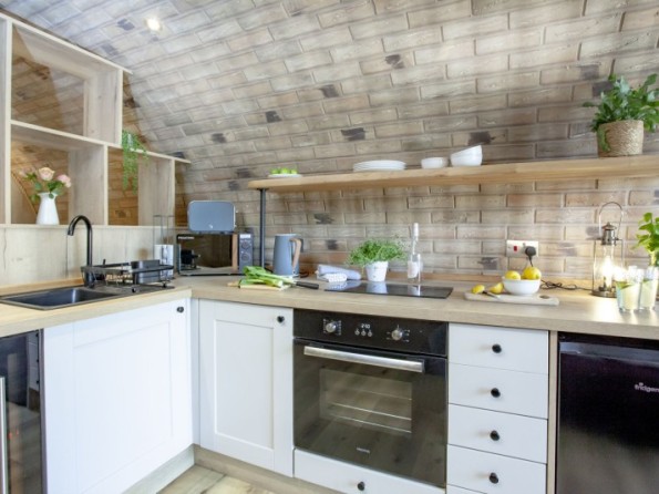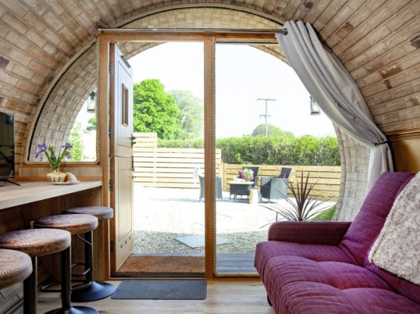 A huge circular doorway with lantern lighting and a wooden front door invites guests into the open plan living/ dining area which has a large, comfy sofa that converts to a sofa bed for extra sleeping, as well as a flat screen Smart TV. There are also ceiling Bluetooth speakers and colour changing LED lights