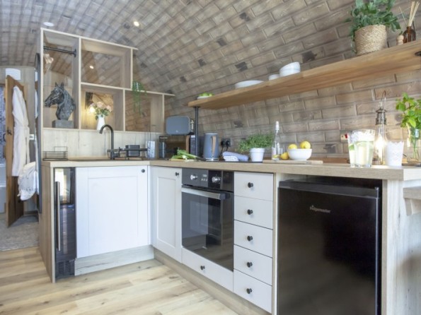 The contemporary kitchenette features a range of appliances including a small hob and oven, under-counter fridge, built-in wine cooler, toaster, kettle, cafetiere, microwave and a range of cookware and utensils