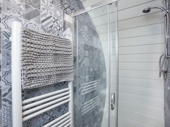 This beautiful bathroom features a walk-in shower cubicle, large, heated towel rail, mirror, hand basin, cabinet and WC