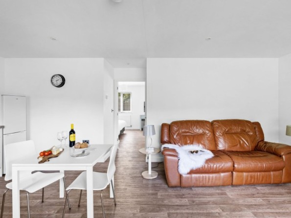 Open plan with the living and dining area with double doors leading out onto the terrace