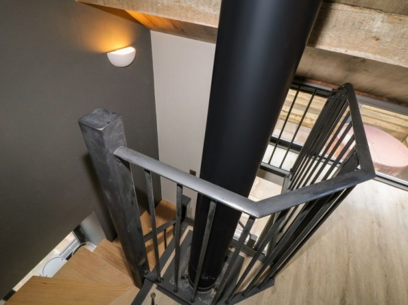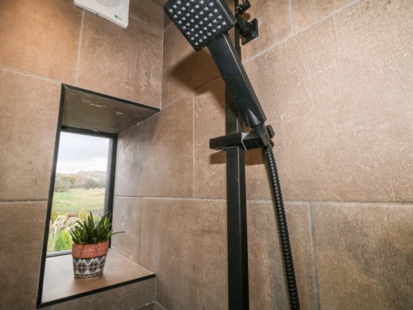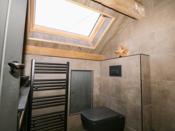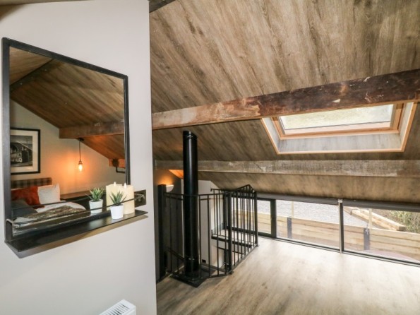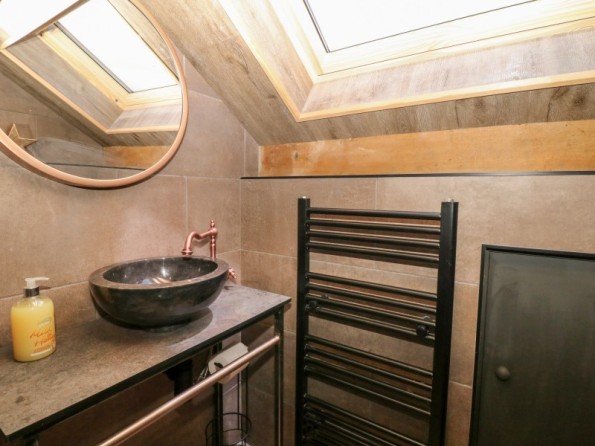 One double bedroom with en-suite walk-in shower, basin, heated towel rail and WC. Open-plan living space with kitchen, dining area and sitting area with woodburning stove and sofa bed