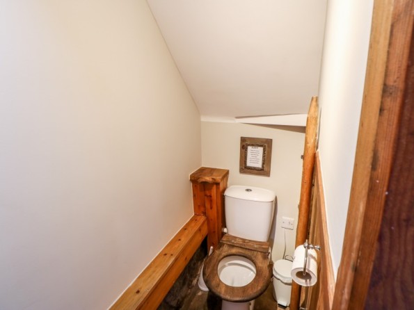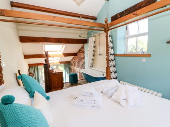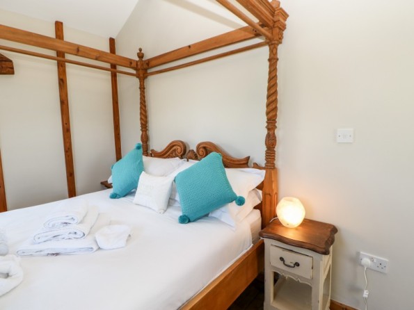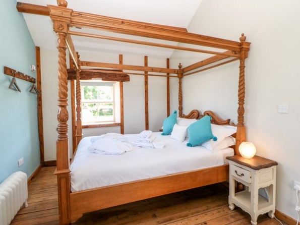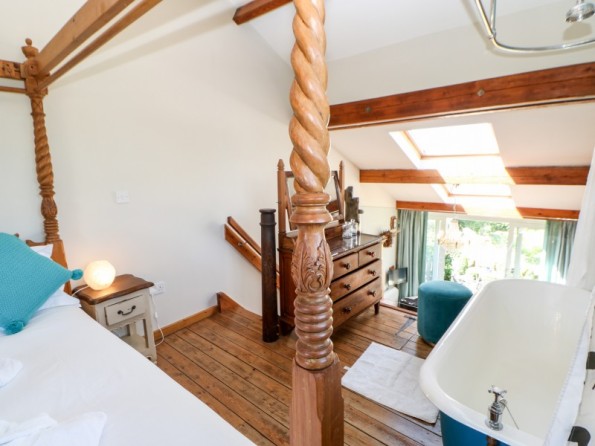 One king-size four poster bed with en-suite bath and shower over. Ground floor basin and WC. Open plan living area with small fitted kitchen, dining area and sitting area with woodburning stove and French doors to patio area. Note: Living area is split-level, with the sitting area two steps higher than the kitchen and dining area.