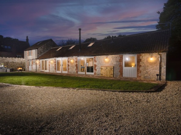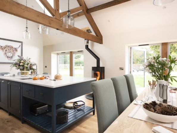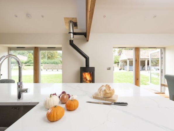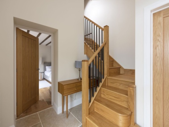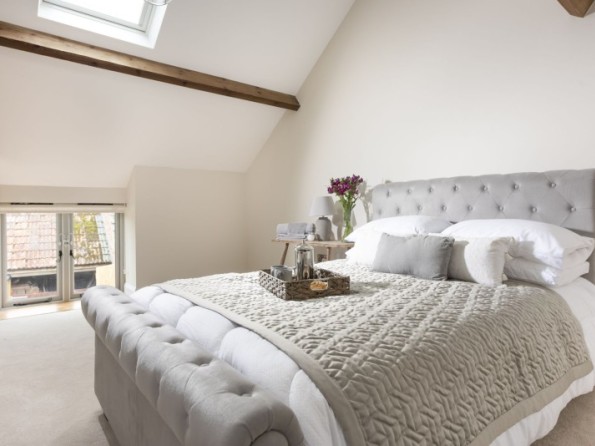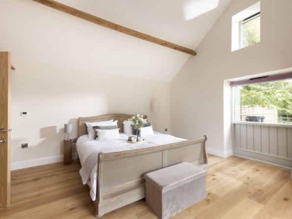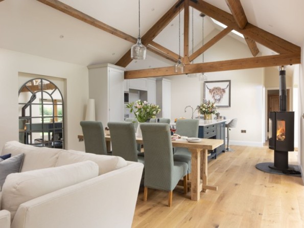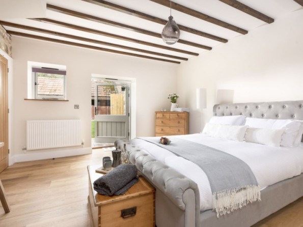 Inside, the atmosphere is one of warmth and elegance, with neutral tones and natural textures creating a space that feels both homely and inviting. Sumptuous soft furnishings and modern features adorn the rooms, and an atmosphere of airiness pervades throughout thanks to high pitched ceilings, wide windows and exposed roof timbers. At the heart of the home, the open plan living / cooking / dining area with its fabulous wood-burning stove, creates a convivial space for spending time together with family and friends, whether lounging across the sinkable sofa in front of the television, chatting over coffee at the breakfast bar while whipping up a full English, or converging round the farmhouse table for a home cooked evening meal. Two beautiful ground floor bedrooms (one with en-suite) have deliciously comfortable beds as well as their own access out to the garden, while upstairs via the home’s chunky oak staircase, lies a third spacious bedroom with a plush, upholstered sleigh bed and double volume ceiling.