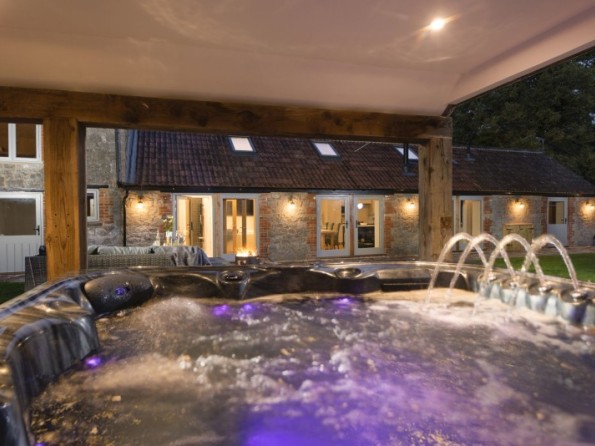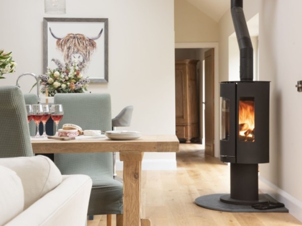 The large courtyard garden is partially laid to lawn and is a quiet place for relaxing in the sunshine. Views of the home’s rural surroundings are on show from nearly every angle as well as from the electric hot tub which sits beneath its own open-sided barn and is for the sole use of guests staying at the Cowshed. A rattan outdoor lounge suite with large glass-topped table is the perfect place for spending time together outside and when the evenings draw in, guests can gather around the fire pit for drinks and conversation.