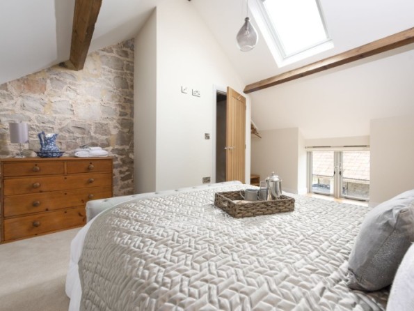 Situated on the ground floor to the left of the entrance hall, this bedroom features exposed roof timbers and a natural stone feature wall as well as access out to the courtyard. It’s furnished with a king size bed, bedside tables with reading lights, a free standing single wardrobe, chest of drawers and a console table.
