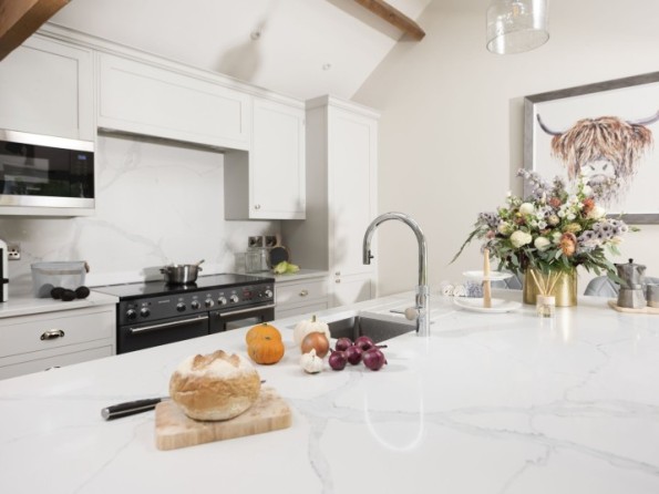 Located on the ground floor, the contemporary kitchen features a fantastic island unit with white stone work surfaces, a sink and Quooker tap for boiling, sparkling and ice-cold water. The island also doubles as a breakfast bar with three leather bar stools for seating. A range of large and small appliances are provided including an induction hob and electric fan-assisted range cooker, fridge, freezer, washing machine, dishwasher, microwave, Nespresso coffee machine, iron and ironing board, toaster, kettle and vacuum cleaner