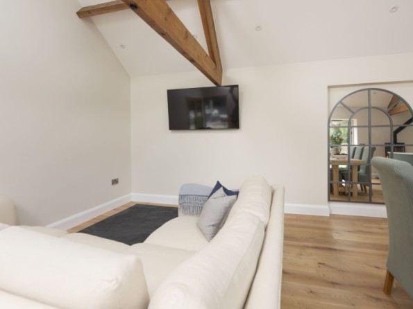 Situated on the ground floor this lovely room is open plan with the kitchen and dining area and has large French doors to the outside courtyard as well as double doors that lead into the hall. Oak roof trusses and high-pitched apex ceilings give the room a spacious feel, with a large L-shaped sofa, flat screen Smart TV and Bluetooth speaker creating the perfect place for unwinding in.