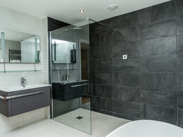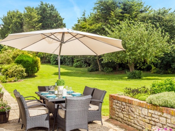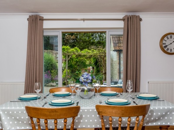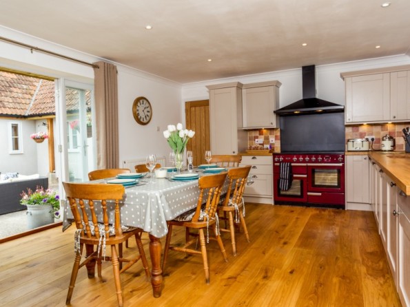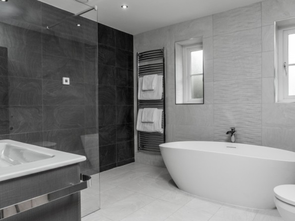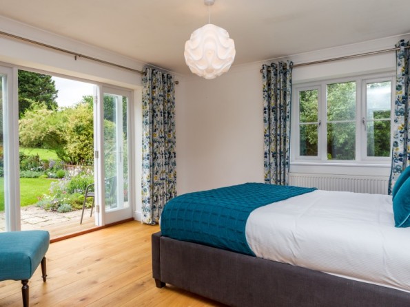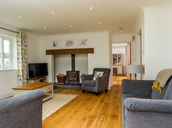 All-ground-floor. Three bedrooms: 1 x king-size double with walk-in wardrobe and en-suite shower, basin and WC, 1 x double, 1 x twin (zip/link can be super king-size double on request). Bathroom with freestanding bath, shower, basin and WC. Basin and WC. Kitchen/diner. Utility. Sitting room with woodburning stove