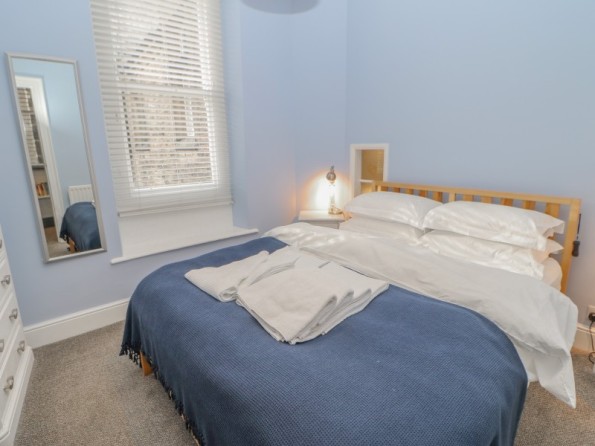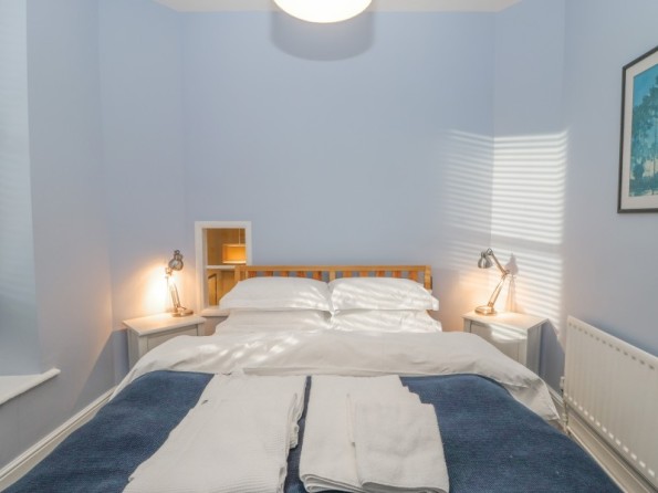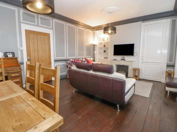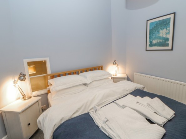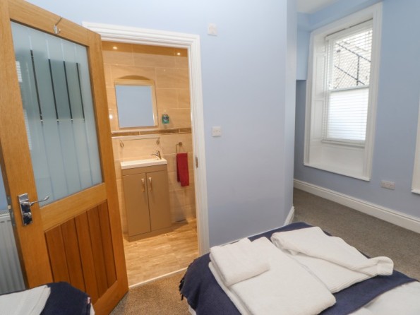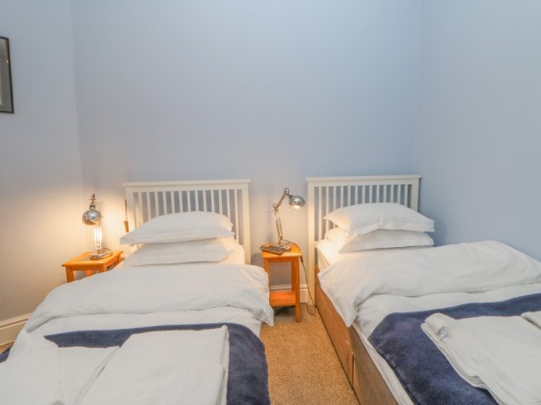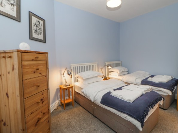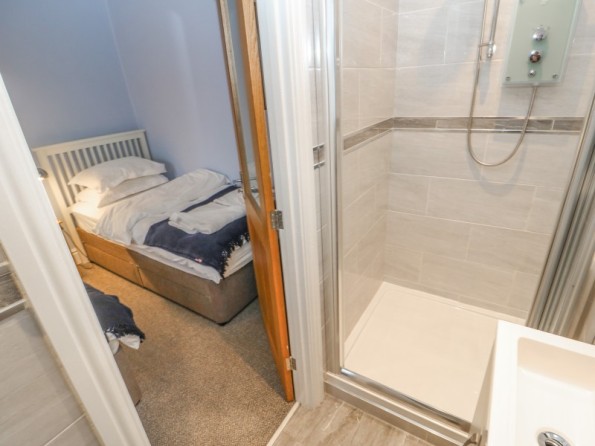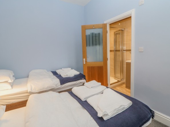 Over three floors. Two first floor bedrooms: 1 x king-size double, 1 x twin with en-suite shower, basin and WC. Second floor shower, basin and WC. First floor open plan living area with kitchen, dining area and sitting area with electric fire. Ground floor utility.