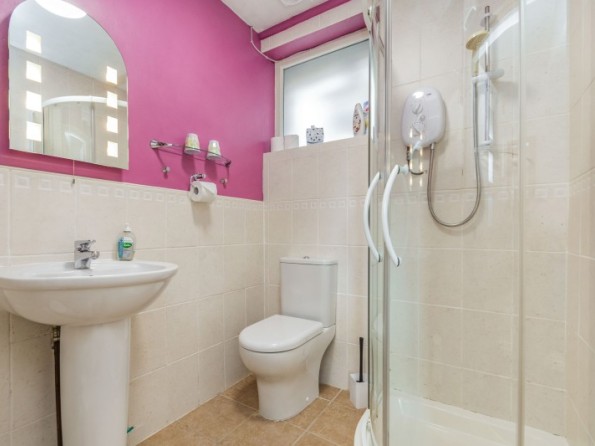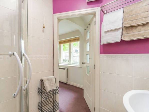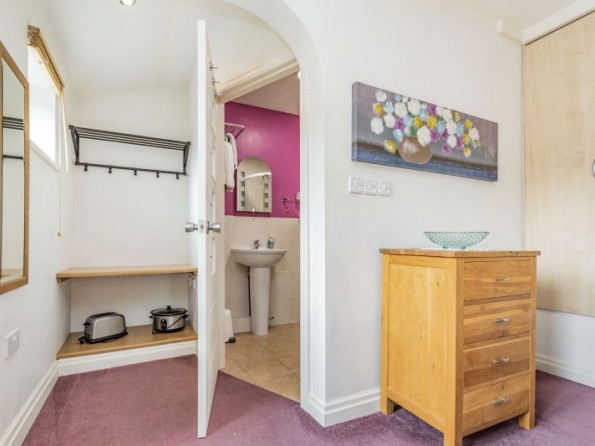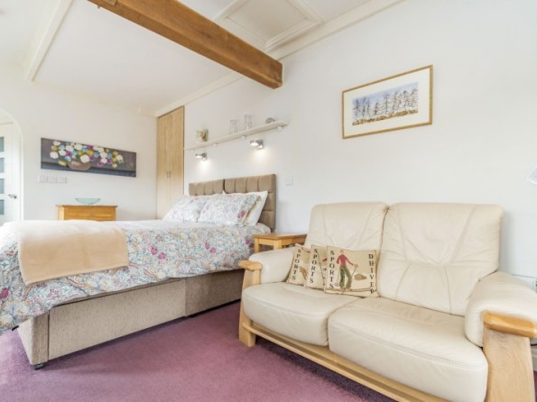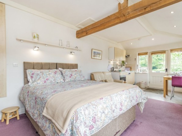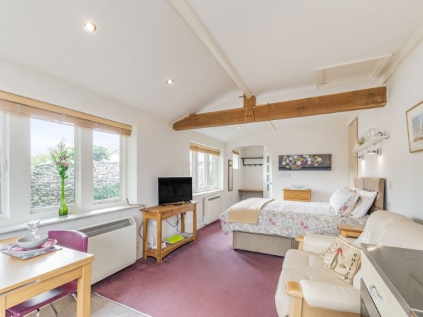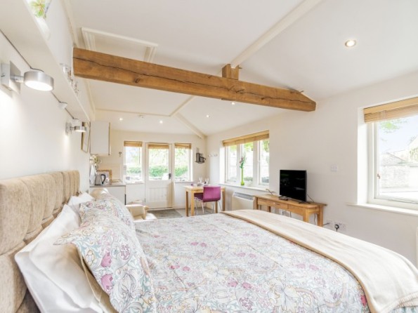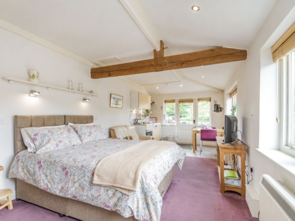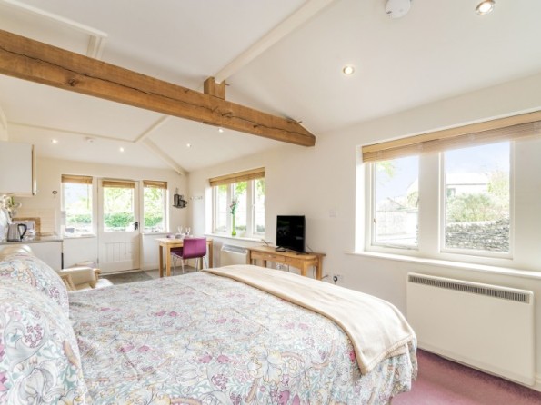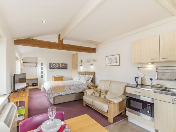 Open plan studio accommodation with king-size double bed (zip/link, can be 2'6" twins on request), kitchen, dining area and sitting area. Shower room with shower, basin and WC.