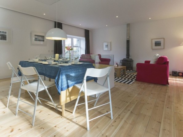 Two downstairs bedrooms: 1 x super king double with en suite shower room with shower, WC and basin, 1 x king size double (converts to 2' 6' twin) with en suite bathroom with bath, shower over, WC and basin. First floor sitting room with wood burning stove. Kitchen with dining area.