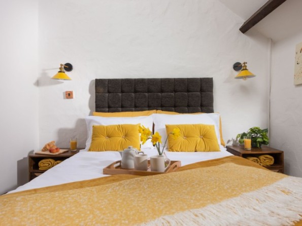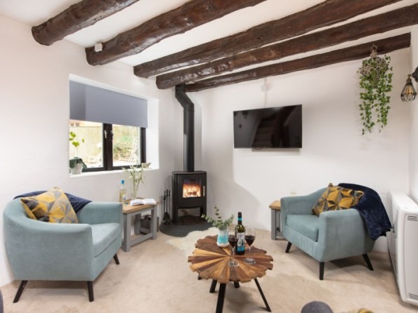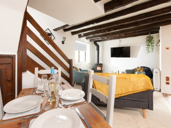 Inside, the kitchen and dining area are open plan with the living room where a sofa and armchairs, arranged around the wood-burning stove, create a charming space to relax in. Exposed roof timbers and original stone walls nod to the cottage’s past, and a large TV provides entertainment on chillier days spent indoors. Two delightful upstairs bedrooms (both with wall-mounted flat screen TV’s) as well as a modern family bathroom means plenty of space for either two couples or a small family of four, while outside there’s a courtyard with outdoor furniture, a BBQ and a hot tub.