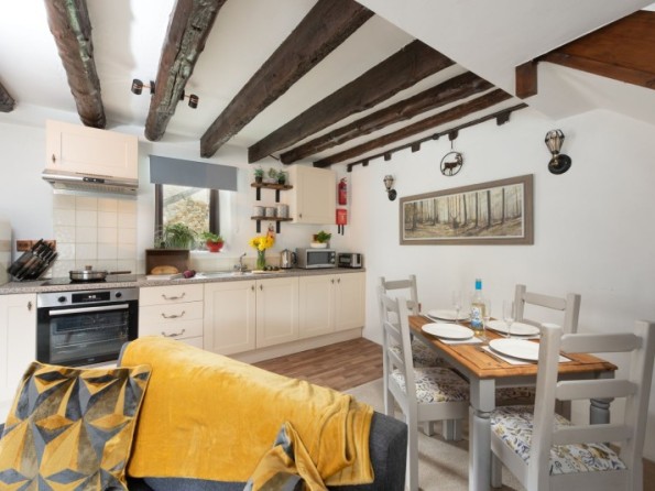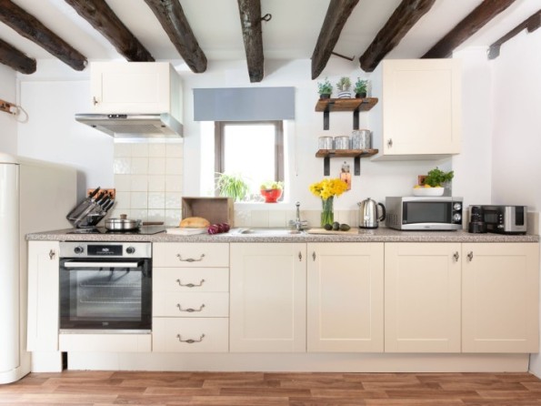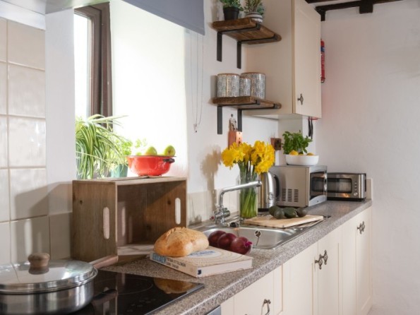 A lovely little kitchen offers guests ample worktop space for preparing meals and features a range of appliances that include an electric fan-assisted oven and grill, solid plate electric hob, microwave, fridge, freezer, toaster and kettle. Other items are a cafetiere, iron / ironing board, vacuum cleaner and a range of cookware, crockery, glasses and utensils