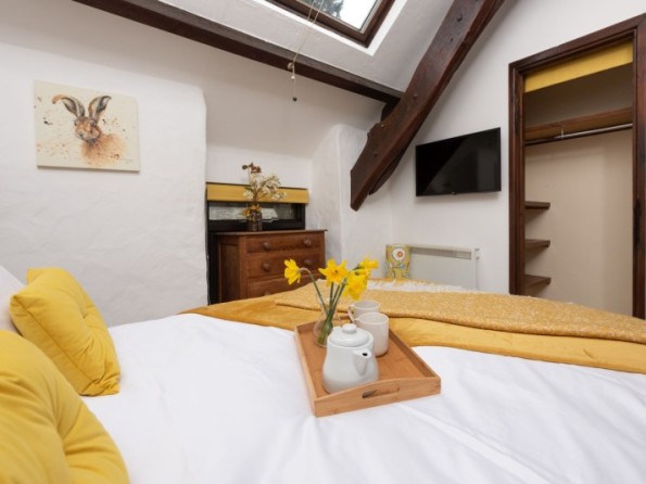 Upstairs on the first floor, this bedroom is furnished with a double bed, side tables with reading lights, a chest of drawers, walk-in wardrobe and a wall mounted Smart TV. A large overhead window allows for plenty of natural light to flood the room, and the original timbers and chunky whitewashed stone walls add character