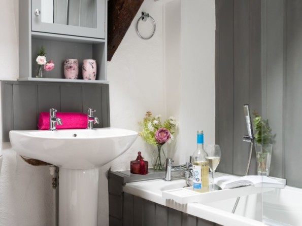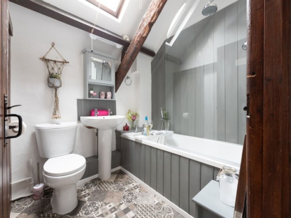 This lovely bathroom features wonderful exposed roof trusses with light pouring in from the overhead window. It features a bath and over bath shower as well as a hand basin, cabinet with mirror and WC