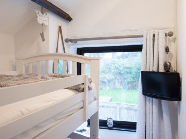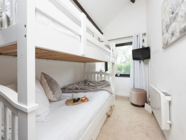 Also on the first floor, this twin bedroom has garden views and is furnished with roomy bunk beds with storage underneath as well as a wall mounted Smart TV, bedside tables, mirror, built-in wardrobe and chest of drawers