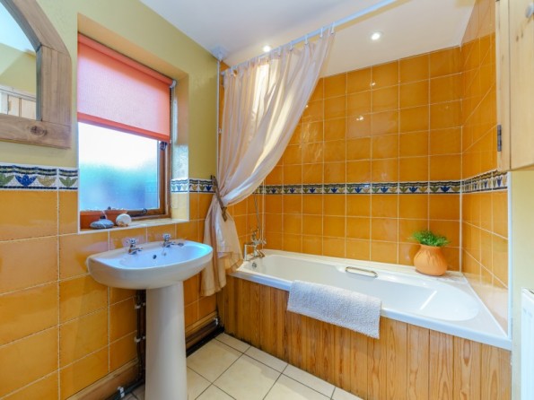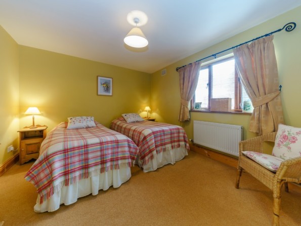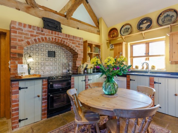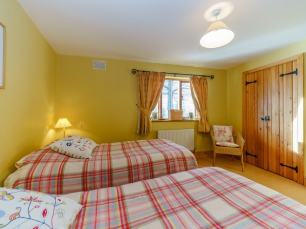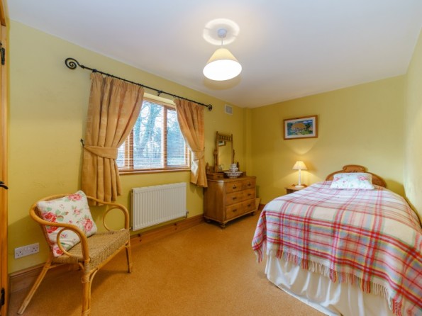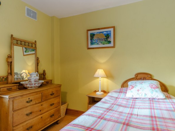 Three bedrooms: 1 x four poster double with walk-in wardrobe and shower room with shower, basin and WC, 1 x ground floor twin, 1 x ground floor single. Ground floor bathroom with bath with shower over, basin and WC. Well-equipped kitchen with dining area. Sitting room with woodburner. Note: Shower room is in a small confined area under beams.
