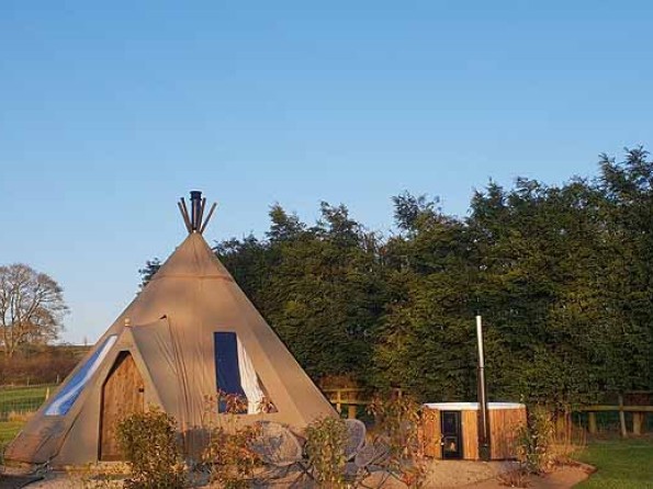 With views across a meadow towards the Peak District hills in Derbyshire, a private wood fired hot tub and luxurious country-chic furnishings, the Hartington Tipi takes glamping to a whole new level.