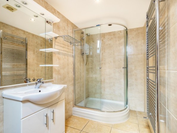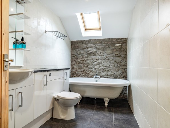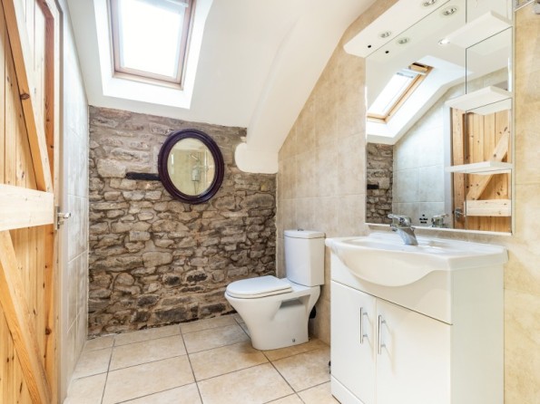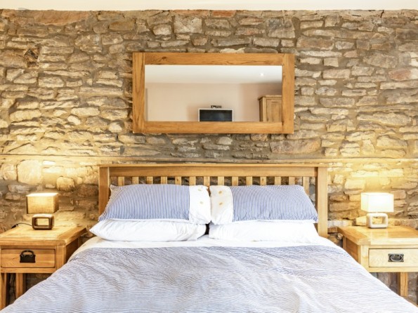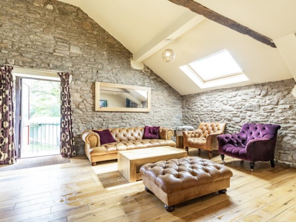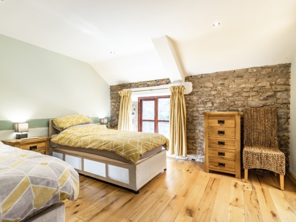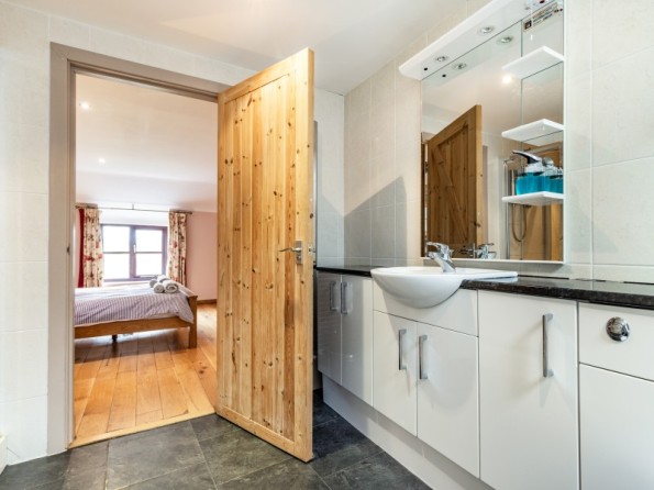 All first floor. Two bedrooms with TV: 1 x king-size double with en-suite bath, separate shower, basin and WC, 1 x twin with en-suite shower, basin and WC. Open plan living area with kitchen, dining area and sitting area with woodburning stove. Boot store room.