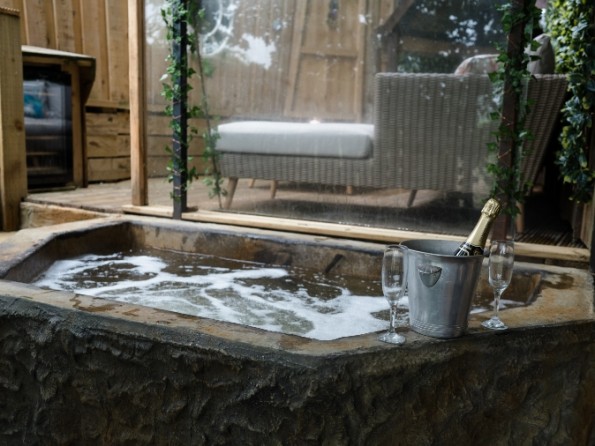 Outside, there’s a large split-level seating area, where you can while away the hours gently stoking the firepit. There’s an electric hot tub to wallow in, and private parking for one car.