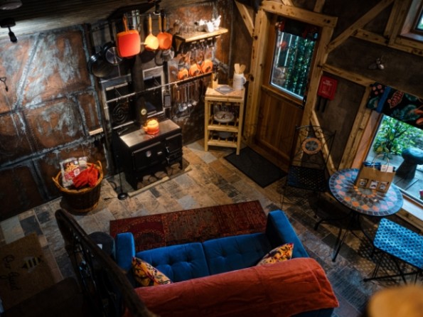 Inside is cosy and charming, with a log burner, underfloor heating and mini cookstove range. The living space is comfortable and the kitchen area also has an under counter fridge freezer and a combination microwave. Steps lead up to the sleeping area with a king sized bed and a glamorous roll top slipper bath (and a private loo). All linen and towels are included and there’s wifi throughout. There are thoughtful touches everywhere, from the toadstool stools to the velvet drapes.
