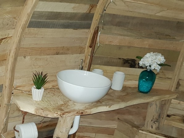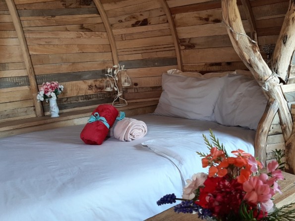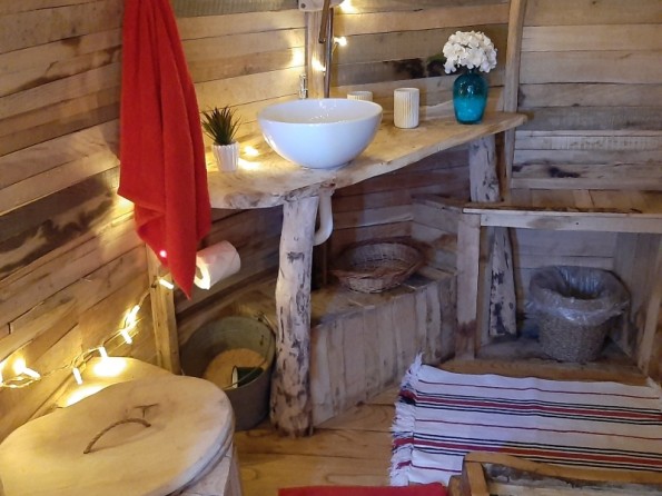 The Hobley House can sleep 2 people in 1 bedroom. It’s fully furnished, with the rustic furnishings made from sweet chestnut trees. There’s a cosy log burner with its own small integrated oven. There’s also a fridge, icebox and separate cooker. The rustic bed is a joy - beautiful to look at and complete with fluffy pillows and blankets made of organic wool and linen. There is a private bathroom with a shower and a composting toilet.