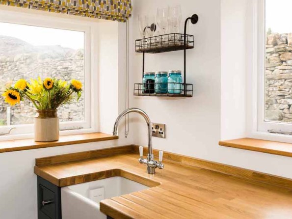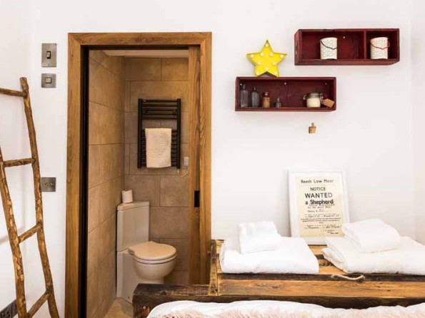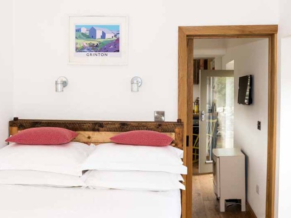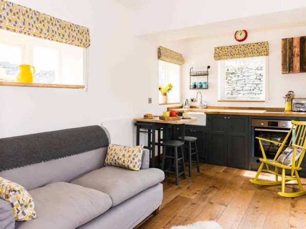 The accommodation is all on one level, with a cosy yet open-plan living area with sofa and rocking chair, a bespoke handmade kitchen, a bedroom with full length glass doors and an en-suite wet room kitted out with fluffy towels and complimentary toiletries.