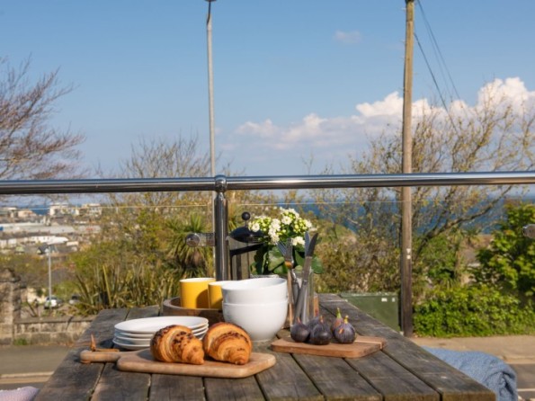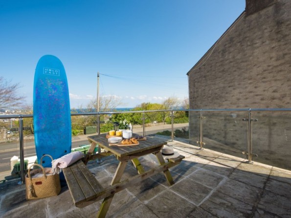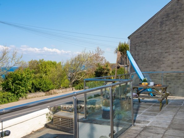 Spacious paved terrace/ balcony with sea glimpses, glass balustrade and a picnic bench. Please note that while this space is designated for the sole use of guests staying at Little Retreat, it isn't enclosed so does flow into the communal area as well