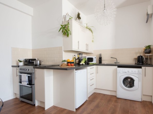 Open plan with the living room, the kitchen is equipped with a range of appliances including an electric oven and hob, microwave, kettle, blender, toaster, fridge and washing machine