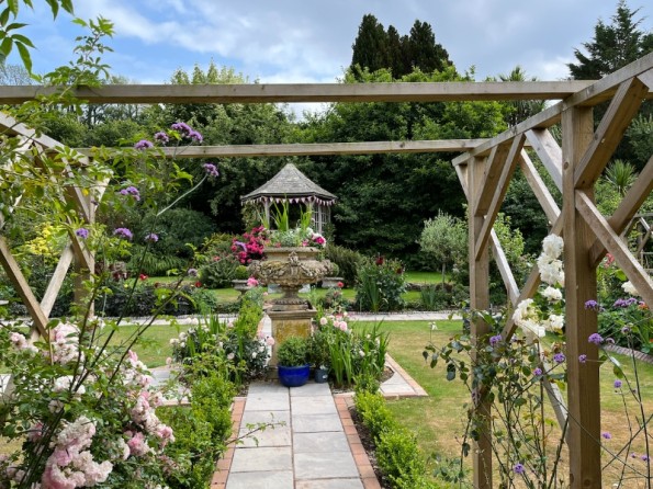 The kitchen leads out onto a private south facing terrace with a BBQ. Guests have access to the large garden with its secluded places and shady corners. If you’re quiet enough, you’ll see and hear a huge variety of birds, and in the evening see bats. The swimming pool is in a conservatory, full of exotic plants, which opens up to the elements in the summer out on to the stream. There is a contraflow pump at one end for those wishing to exercise. The Sauna has a large window looking over the stream. There is a gym equipped with a rowing machine, exercise bikes, a cross trainer and multi gym. The Games Room has pool/snooker, table football and an outside ping pong patio. The grass tennis court is suitable for competitive tennis in the beautiful surroundings of our walled garden. There is a croquet lawn.