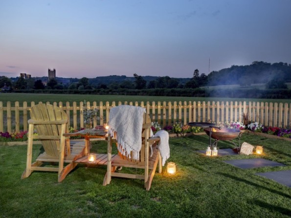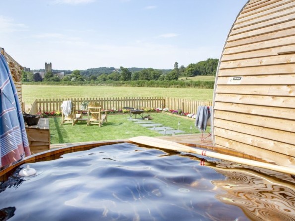 The hut has its own private garden with a seating area to the front. A fire pit, grill and bowl are perfect for BBQ’s or for cosying up in front of in the evenings. The private wood fired hot tub offers stunning countryside and cathedral views and is perfect for relaxation any time of the day. Logs for the hot tub are supplied and more are available to buy on site
