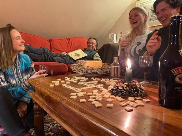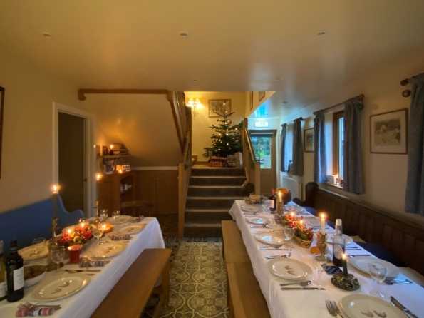 The bunkhouse furnishings are quirky - church pews for kitchen seating, Moroccan goatskin lamps, joiner-made oak bunk beds, Mexican wall tiles and 200 year old stained glass upstairs - all these features give the bunkhouse great character. There are five bedrooms in total - one bedroom upstairs with eight beds (with its own bathroom). Downstairs there are three bedrooms (two of which sleep two, one is a dormitory style bedroom sleeping eight in four bunks), as well as the separate restored shepherd’s hut just outside the back door, with twin beds (one standard single plus one smaller single). Downstairs there are three showers and loos, with a wet room for the less mobile. Each guest has their own light and charging socket. There’s a well equipped kitchen and dining area with two rustic tables with benches and pews, seating up to 22 people. There’s a large electric cooker, microwave, dishwasher and plentiful cutlery, crockery and utensils. Upstairs there is a cosy carpeted sitting room which seats 22. There’s TV and Wifi, as well as a selection of books and games.