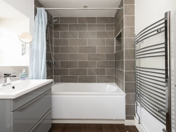 The bathroom is located upstairs and features a bathtub with power shower over, a vanity unit, WC, bath and heated towel rail