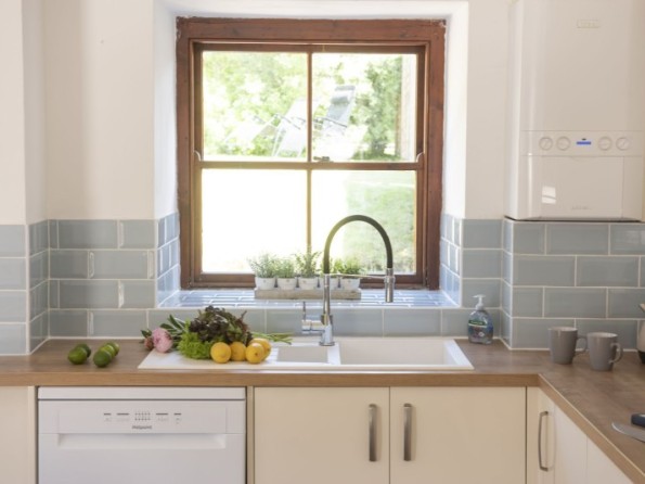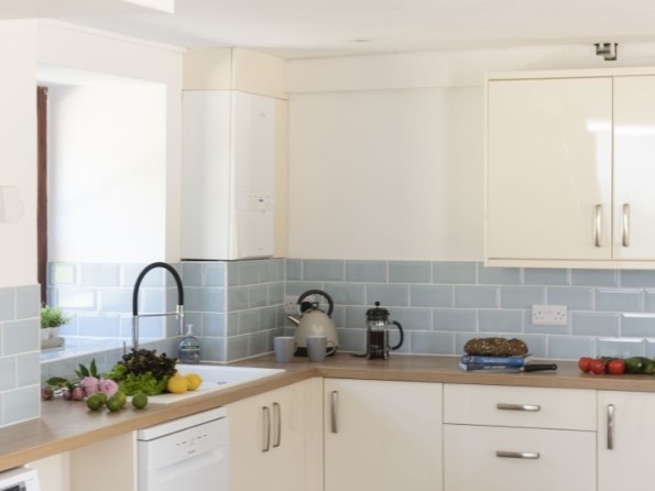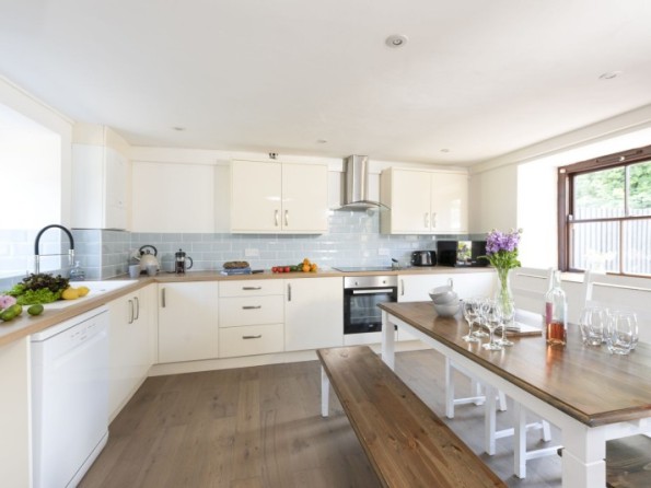 Open plan with the living/dining area, the kitchen is equipped with an electric fan assisted oven, hob, fridge (with small freezer compartment), dishwasher, washing machine, microwave, cafetiere, kettle, toaster, plates, mugs, cutlery, cooking utensils, selection of knives, glasses, tea towels, iron and board, cleaning aides including bin liners, first aid kit, clothes horse, high chair and hand-held vacuum cleaner. The kitchen has access out to the garden