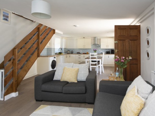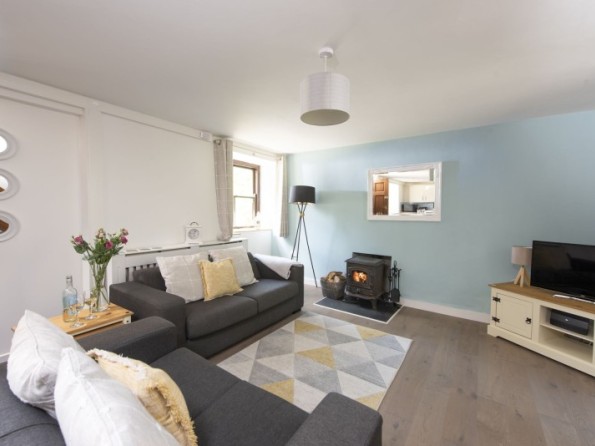 This bright and airy room is open plan with the dining area and kitchen is furnished with a two sofas, Smart LED TV with built-in DVD player, log burner and fireside tool set