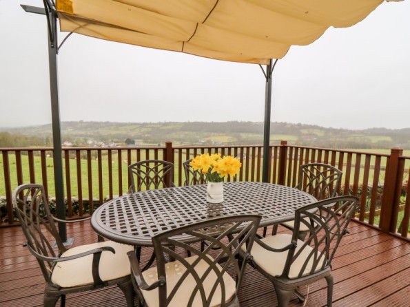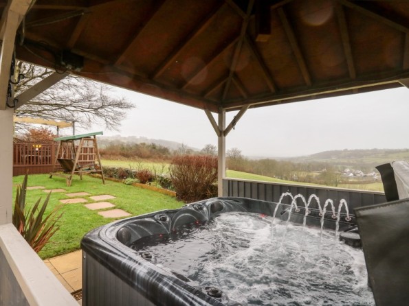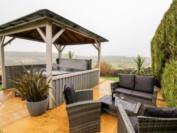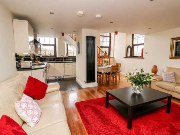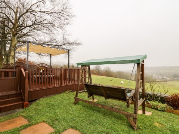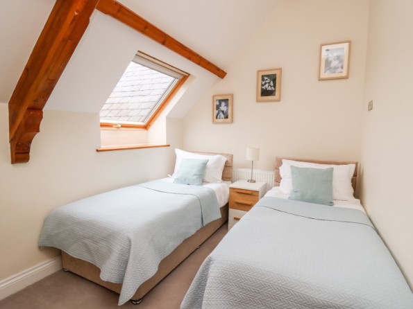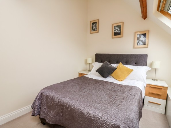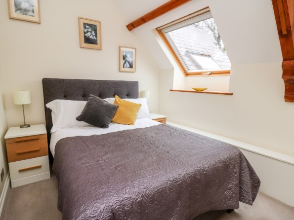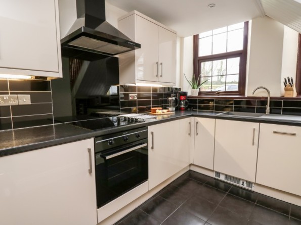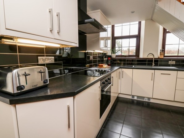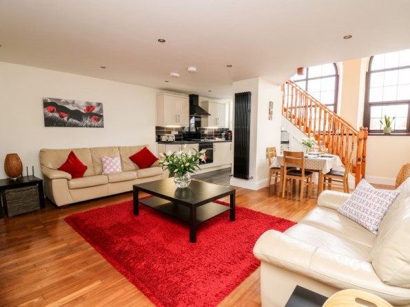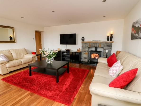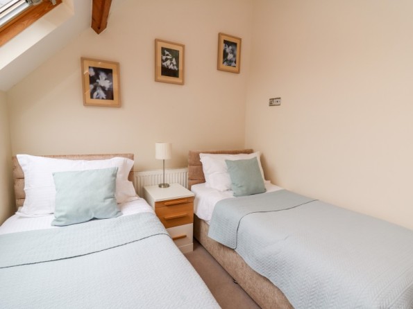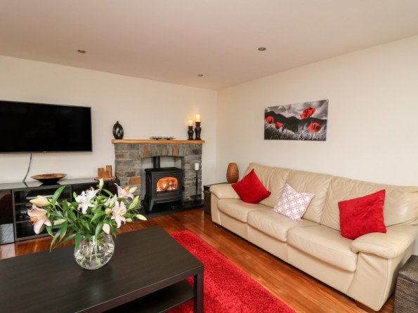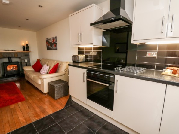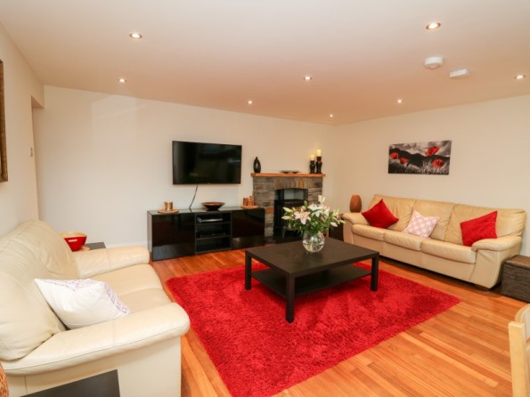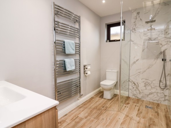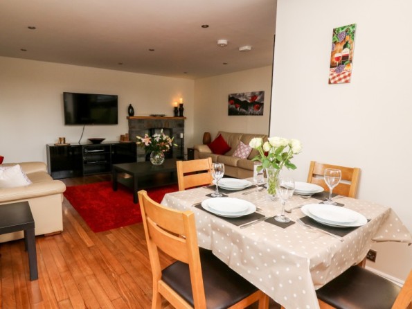 Two bedrooms: 1 x double with TV, 1 x twin. Ground floor bathroom with rain shower, basin and WC. Open plan living area with kitchen, dining area and sitting area with sofa bed and gas fire. Utility.
