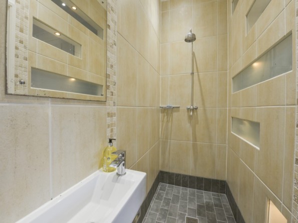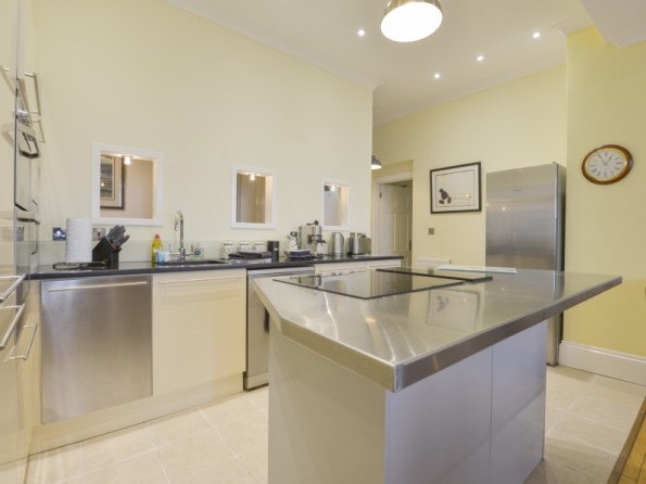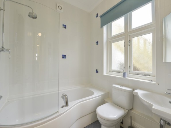 Three ground floor bedrooms: 1 x double, 1 x twin, 1 x king size double with door to garden and en suite shower room with shower, WC and basin. Bathroom with bath, shower over, WC, basin. Open plan living space with seating area with wood burning stove, dining area, kitchen and balcony. Lower ground floor: Utility area with shower and separate WC