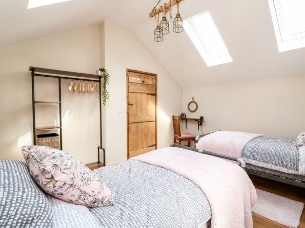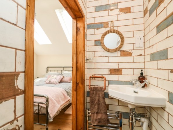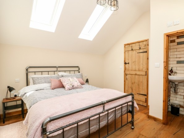 Two bedrooms: 1 x double with en-suite basin and WC, 1 x twin. Ground-floor bathroom with roll-top bath, walk-in shower, basin, heated towel rail and WC. Open-plan living space with kitchen, dining area and sitting area with woodburning stove. 2 electric car charging points available at the property.