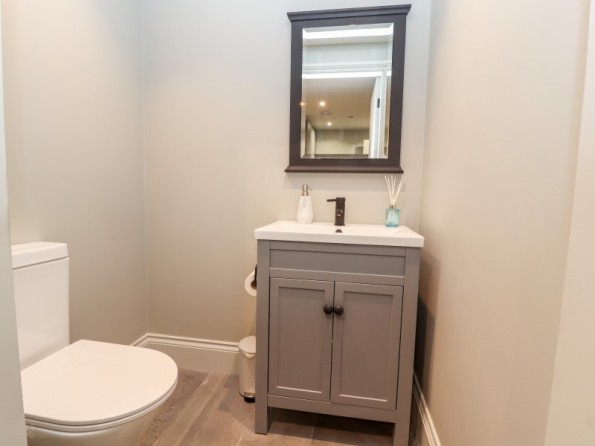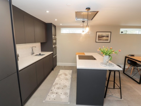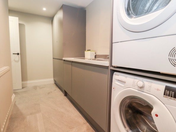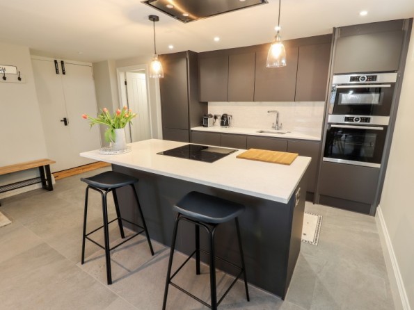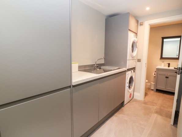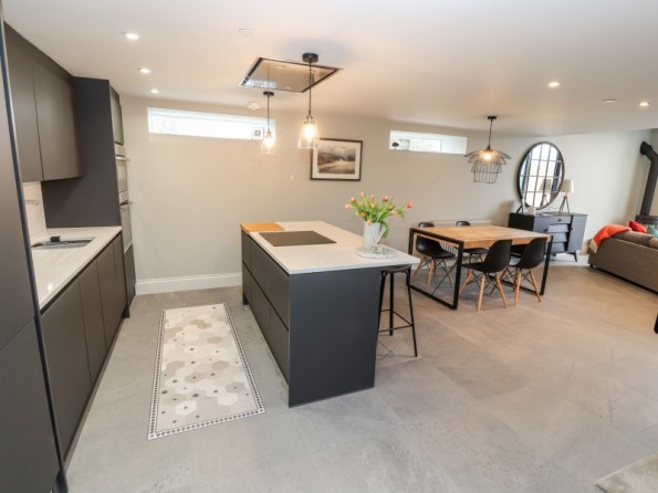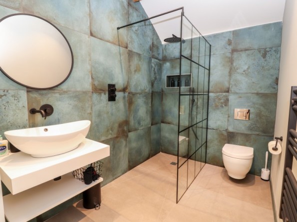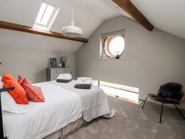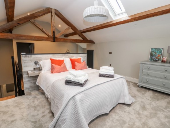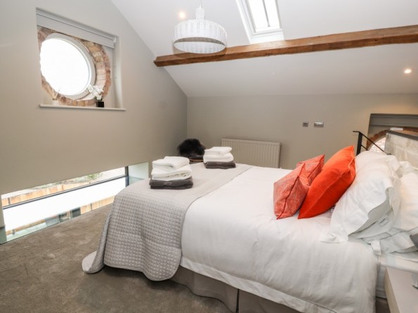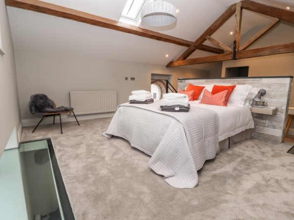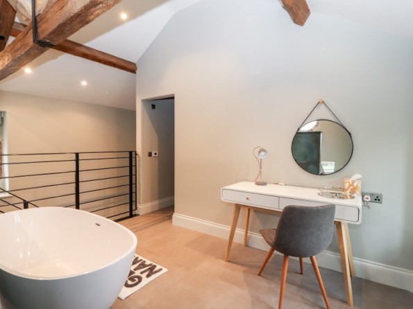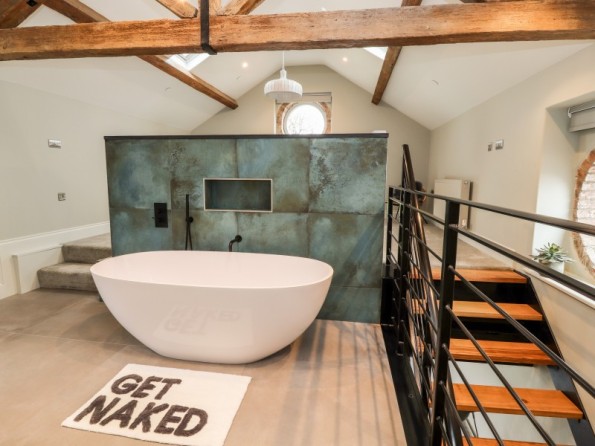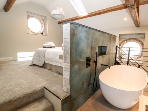 One mezzanine king-size bed with freestanding bath and handheld shower with en-suite walk-in shower, basin and WC. Open-plan living space with kitchen, dining area and sitting area with woodburning stove. Utility