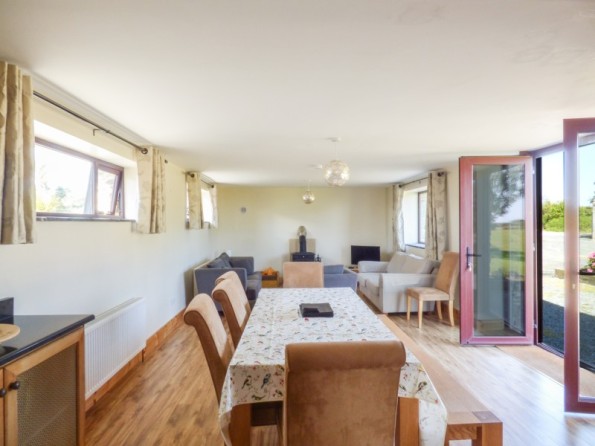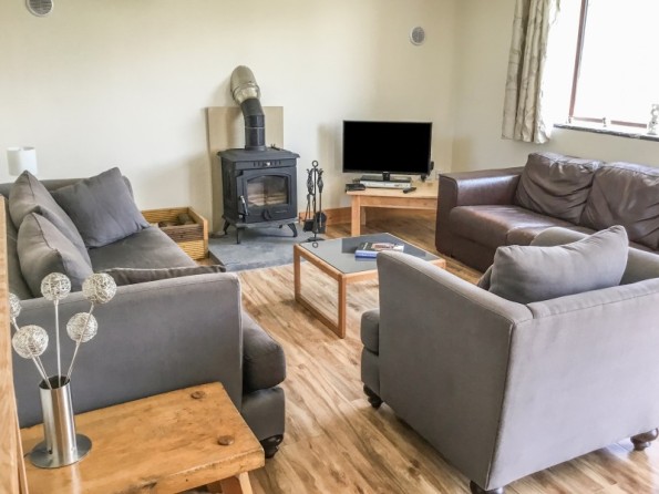 Open plan living area with kitchen, dining area, sitting area and woodburning stove.
