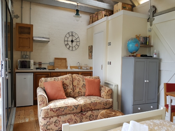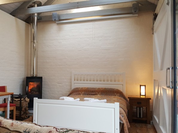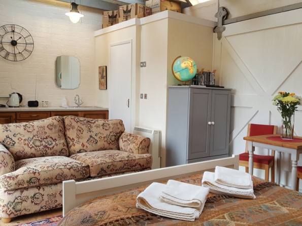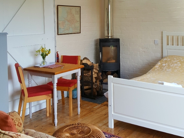 The studio has a double bed, a modern en-suite bathroom, a table with two chairs, a wardrobe and a sofa bed, as well as a wood burning stove and an amazing home cinema screen with a collection of DVDs. It also has a kitchenette with a gas hob, a fridge freezer, a kettle, a microwave and all the basics.